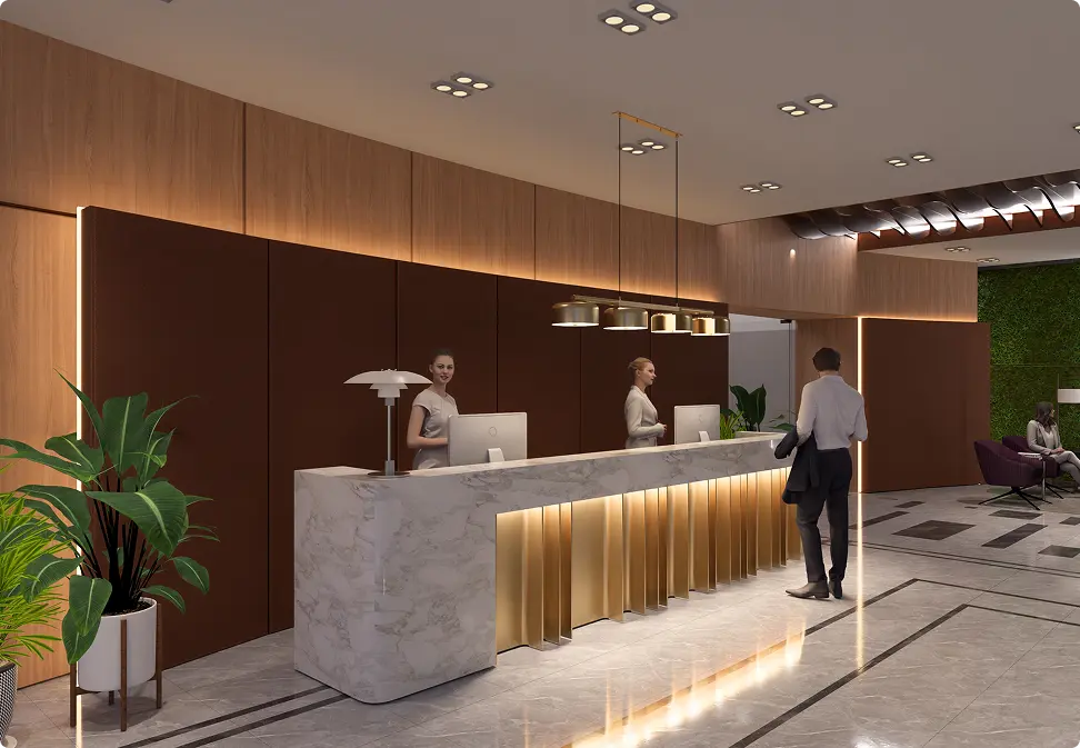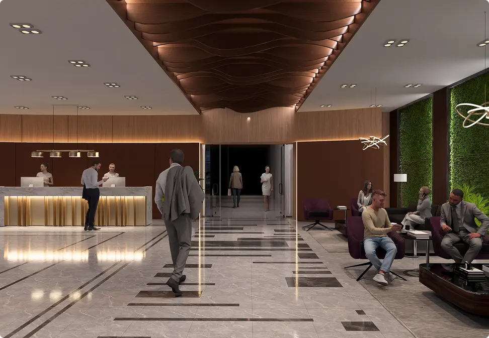 The grand reception and landscaped surroundings create a strong first impression while maintaining business practicality.